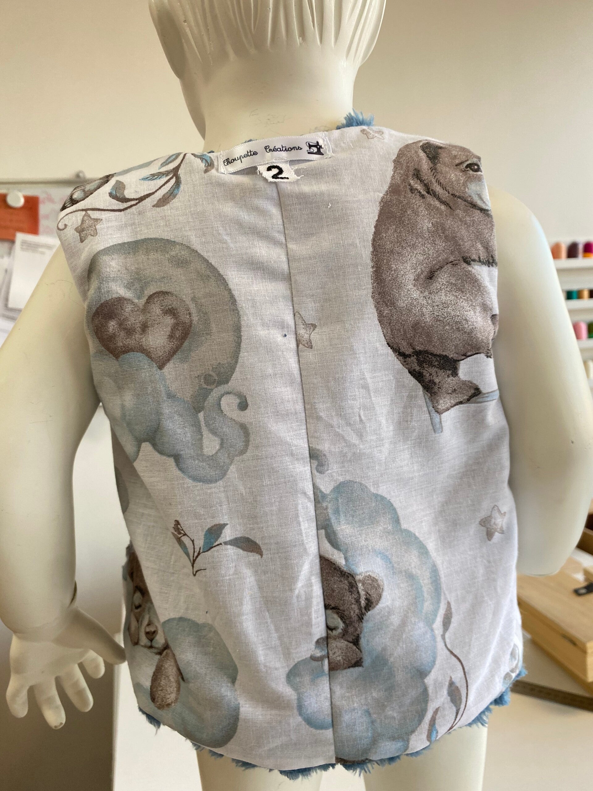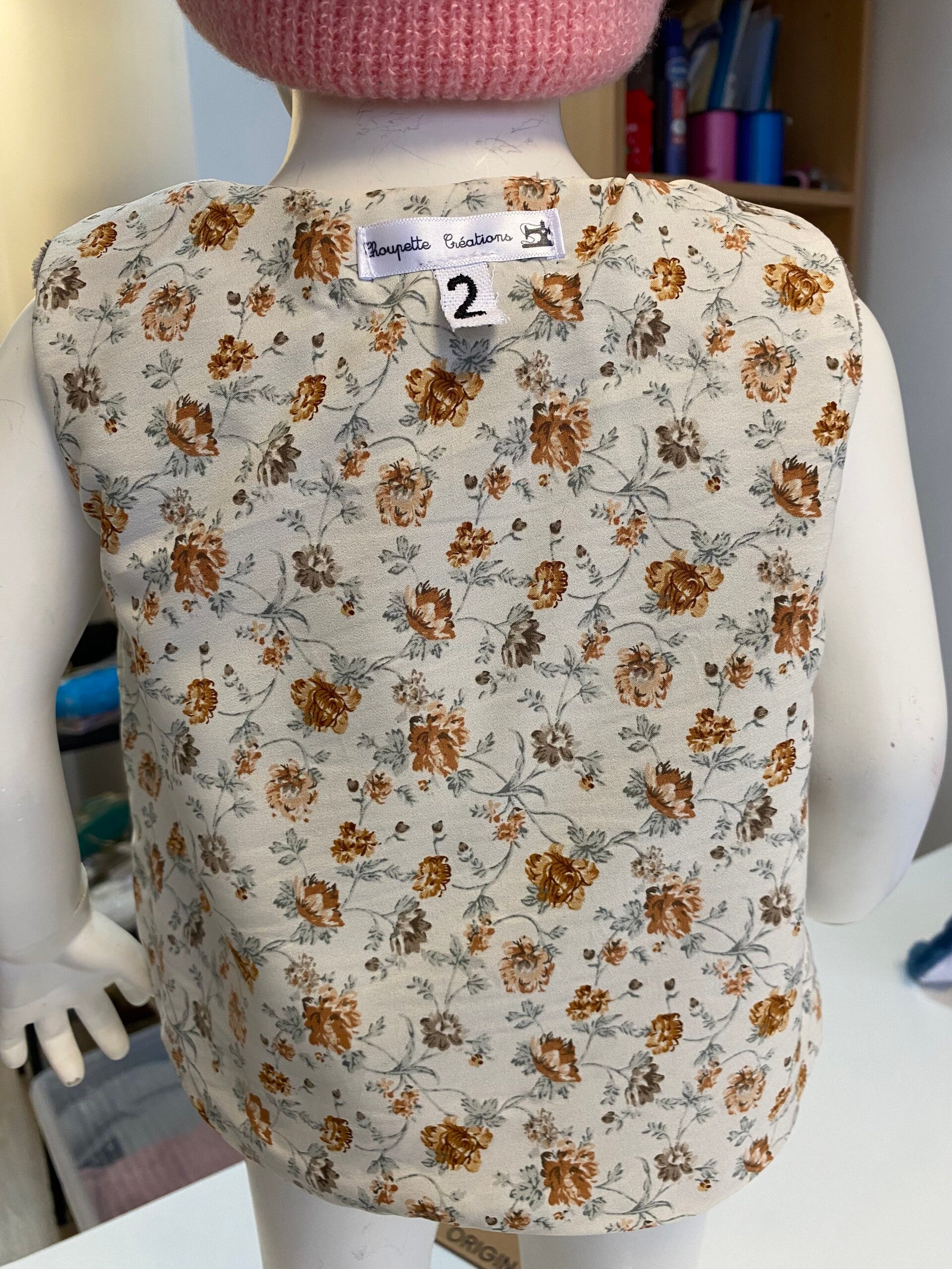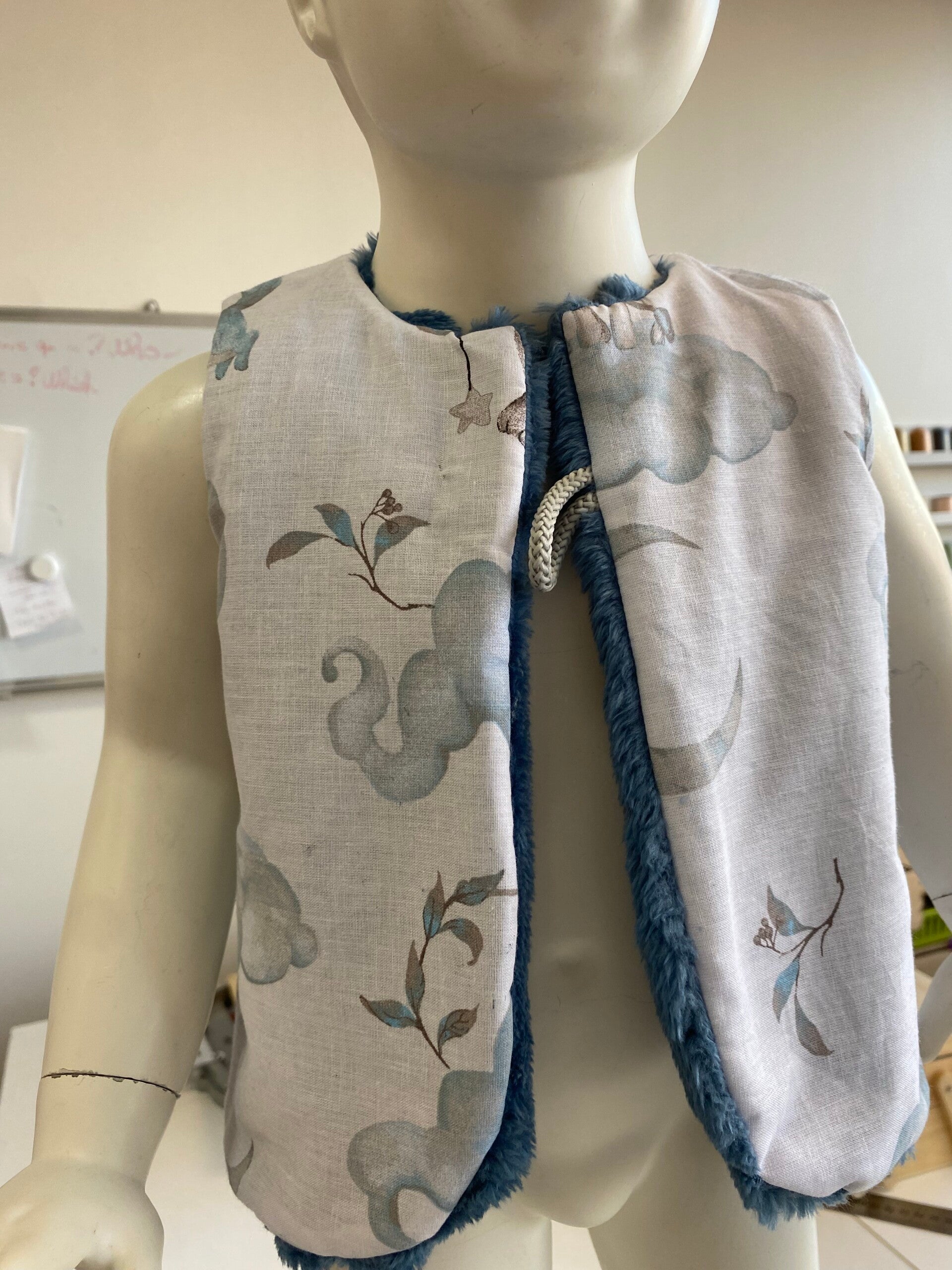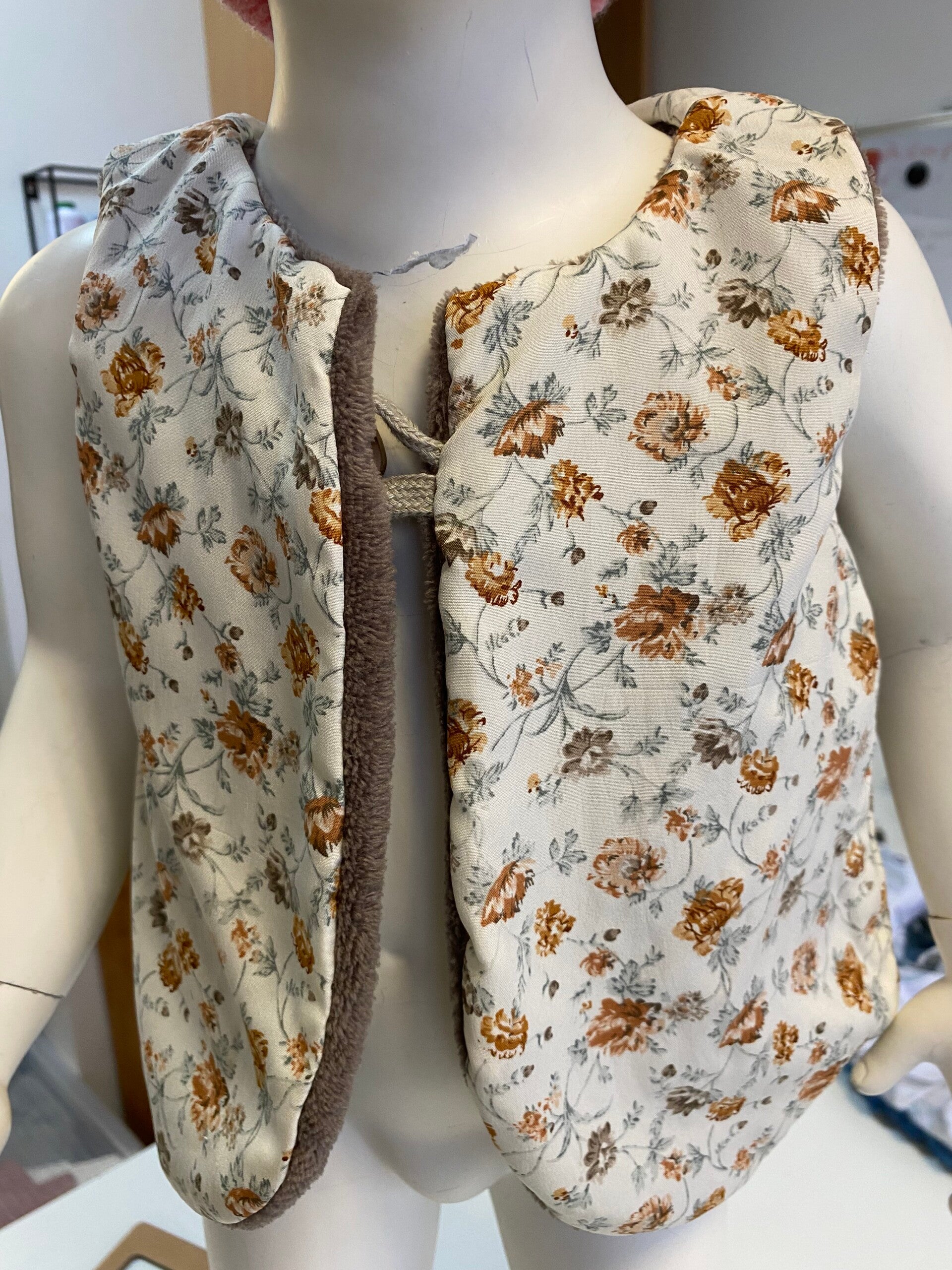 Gilet réversible confectionné à la main, alliant une face douce et chaleureuse à une face en coton à motifs délicats. Léger, confortable et facile à enfiler grâce à sa fermeture par bouton en bois, il est idéal pour la mi-saison comme pour l’hiver.