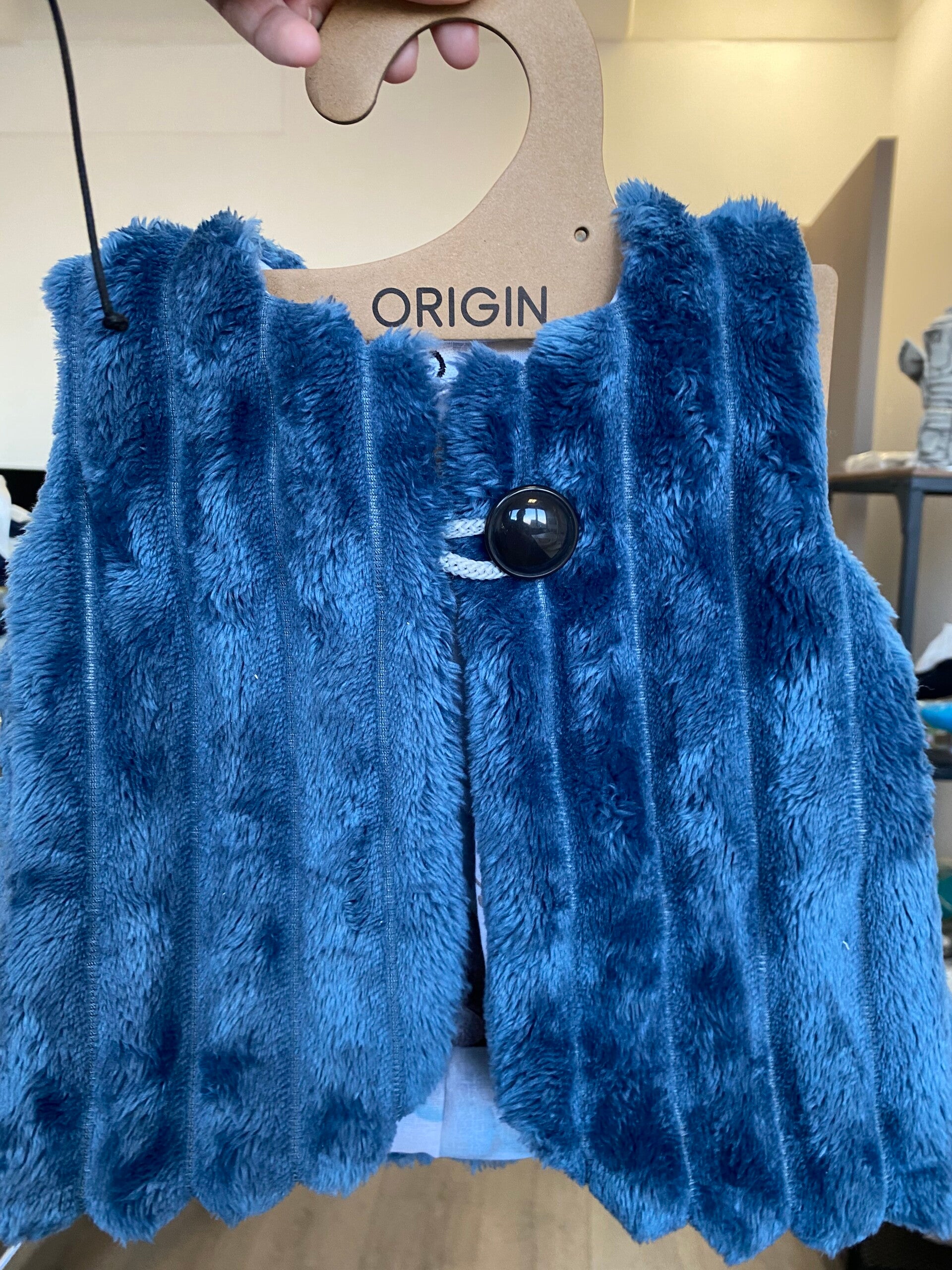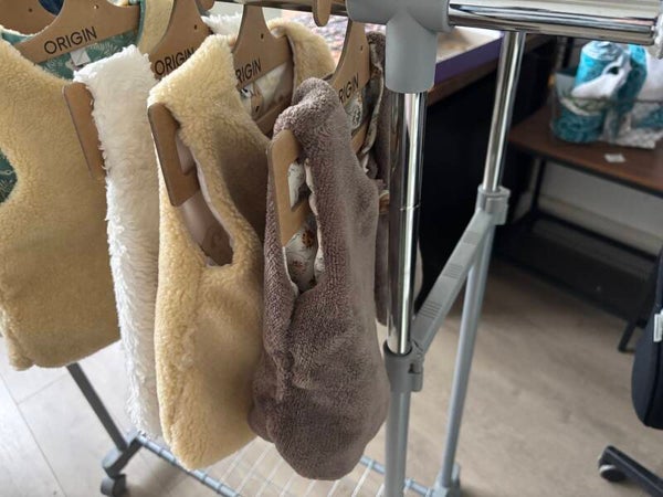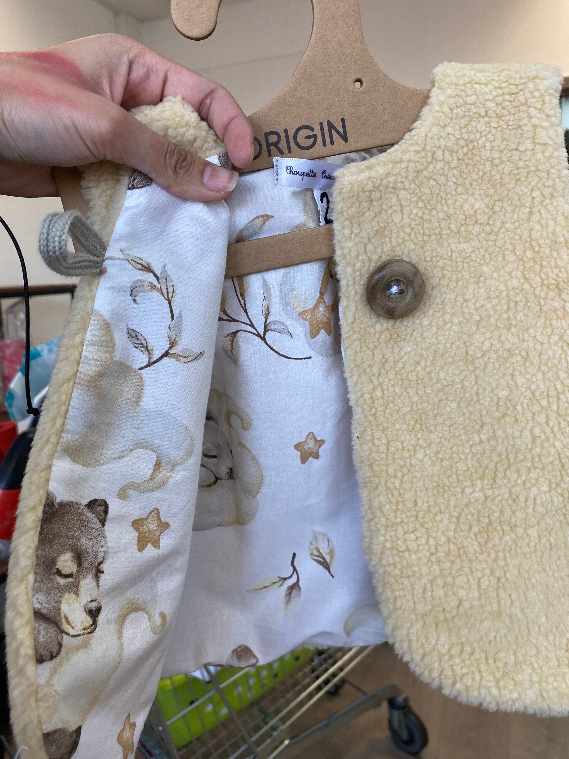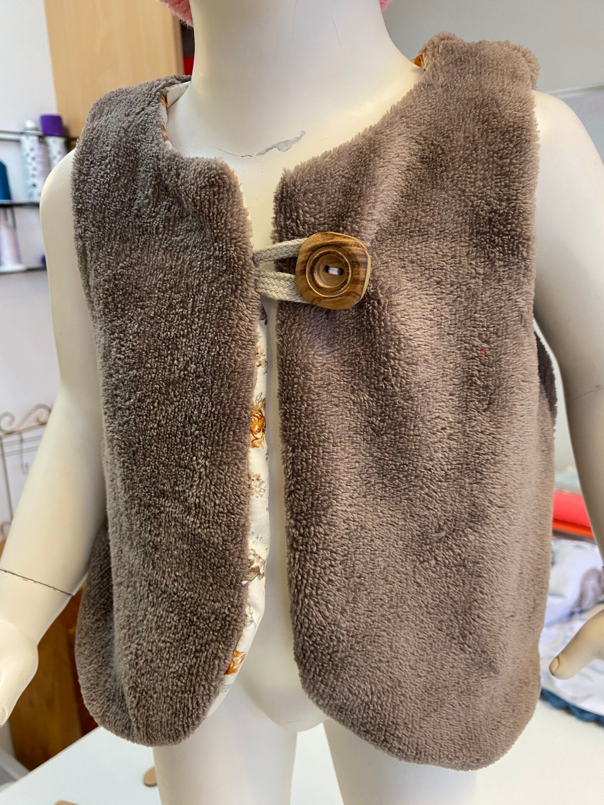 Gilet réversible confectionné à la main, alliant une face douce et chaleureuse à une face en coton à motifs délicats. Léger, confortable et facile à enfiler grâce à sa fermeture par bouton en bois, il est idéal pour la mi-saison comme pour l’hiver.