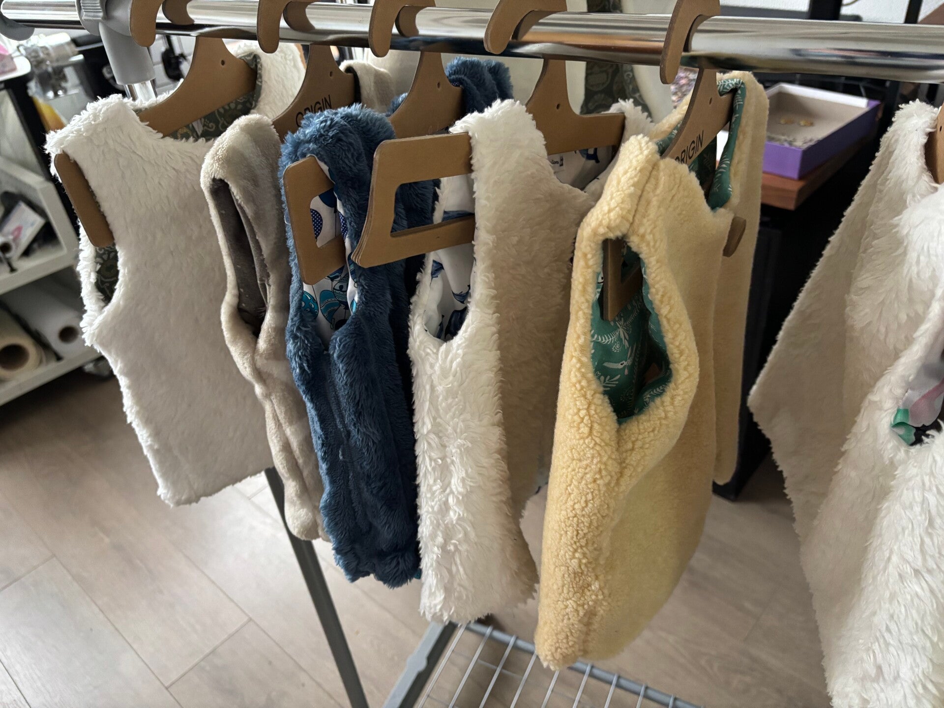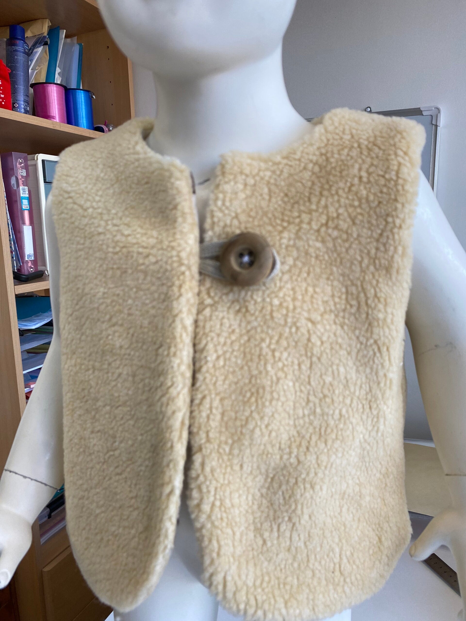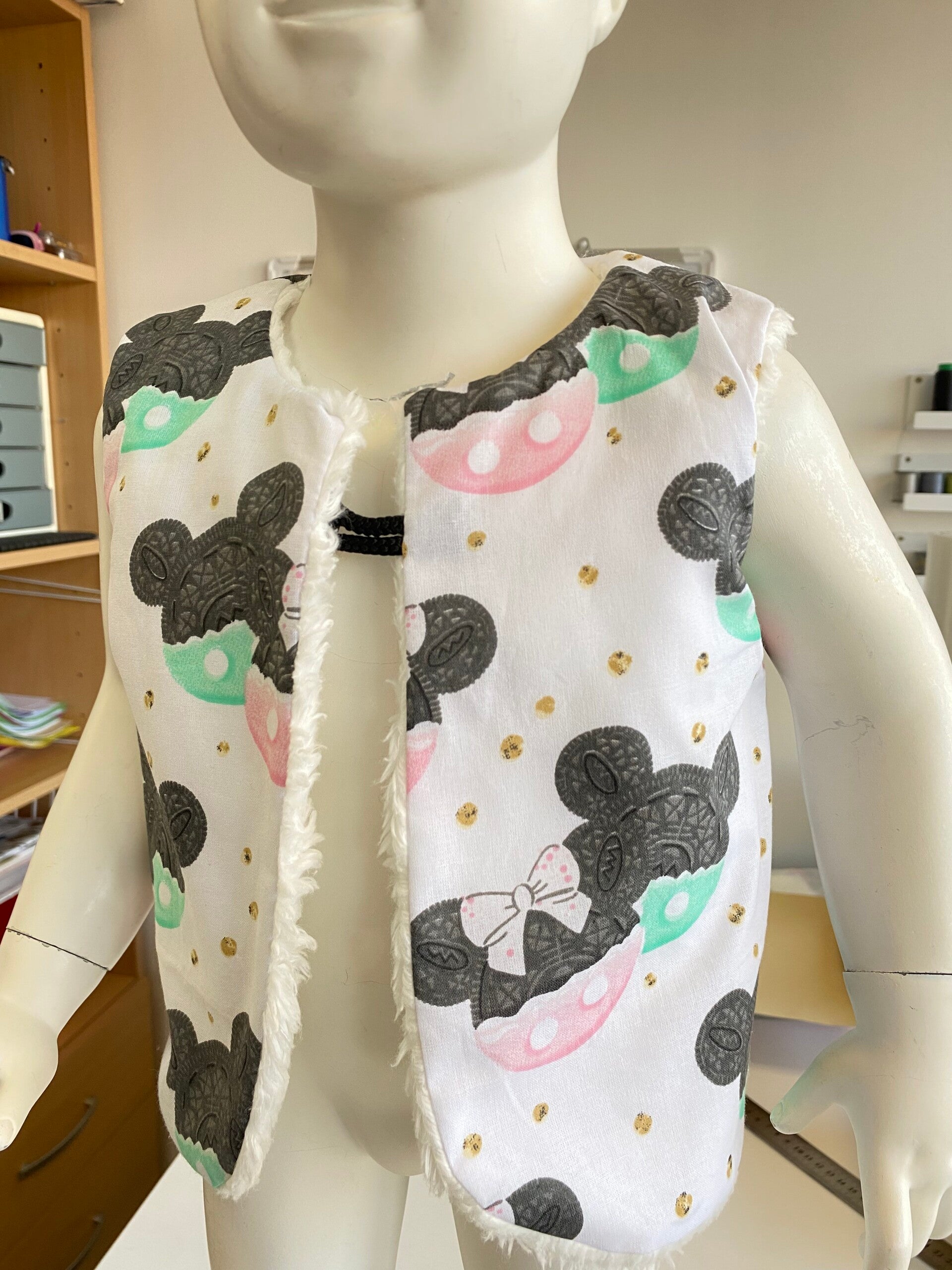 Gilet réversible confectionné à la main, alliant une face douce et chaleureuse à une face en coton à motifs délicats. Léger, confortable et facile à enfiler grâce à sa fermeture par bouton en bois, il est idéal pour la mi-saison comme pour l’hiver.
