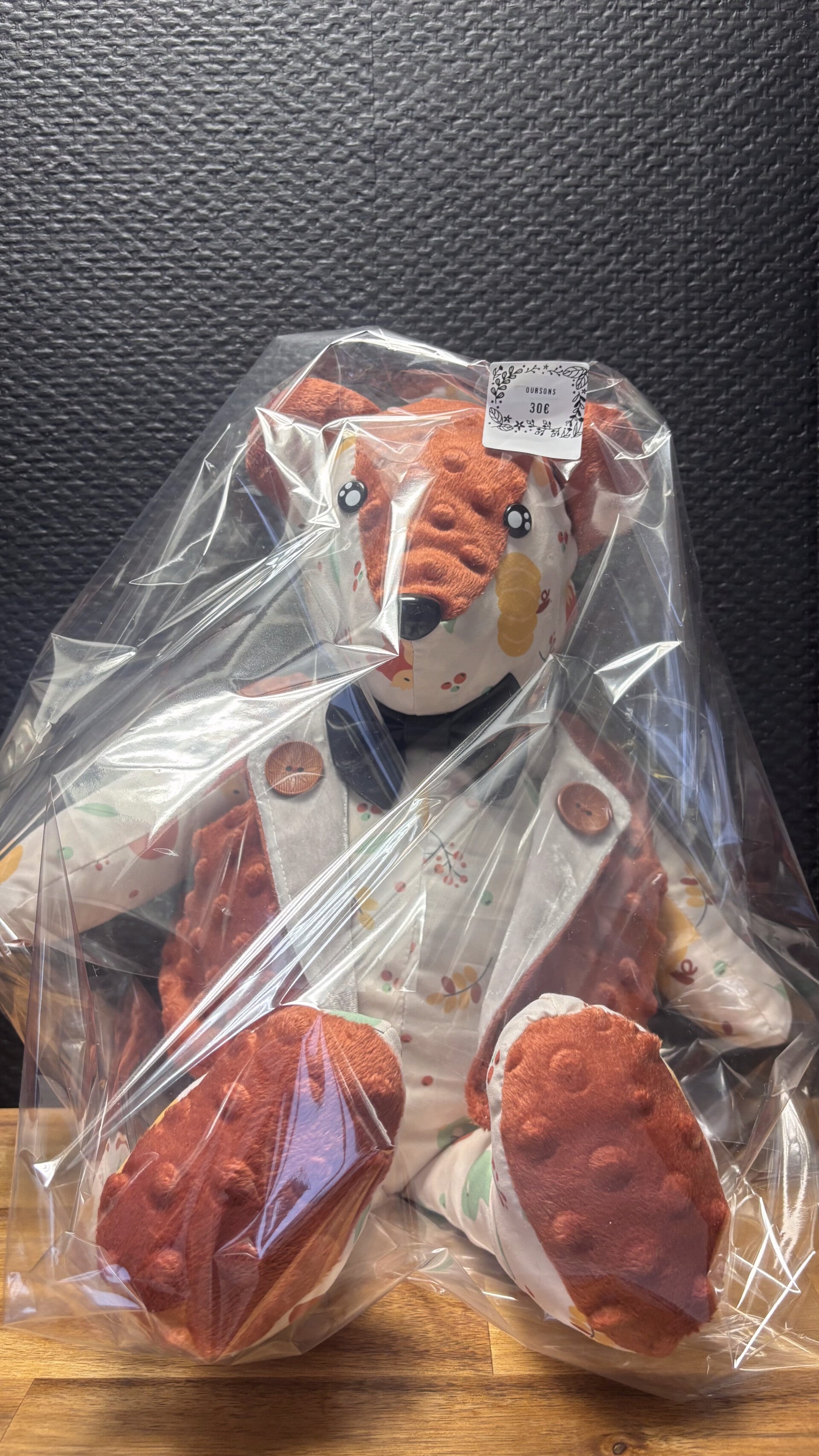 Peluche 1:Ours en velour minky marron,imprimé aux motifs vegetaux .petit noeux papillon noir qui lui donne un coté chic .